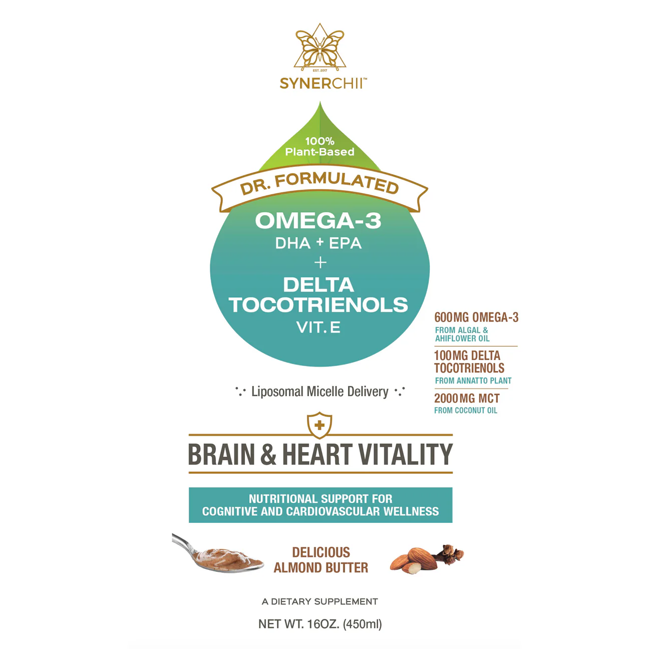 Plant based Omega-3 DHA and Vitamin E formulated with Delta Tocotrienols from Annatto plant — the rarest and most powerful antioxidant on the planet (more potent than any other forms of Vitamin E). Optimized for cell absorption in this delicious formula to provide the ultimate protection for every cell in your body.