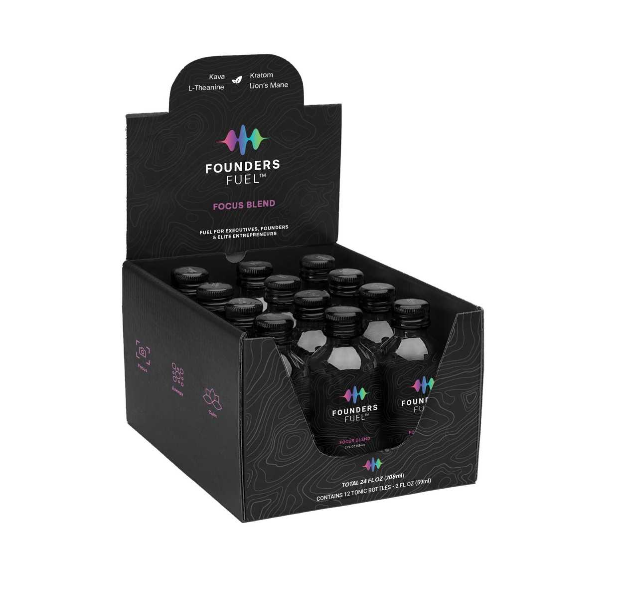 Founders Fuel® Focus Blend is a premium liquid botanical formula in convenient 2oz bottles. Each package contains 12 bottles (24 servings) for a one-month supply.