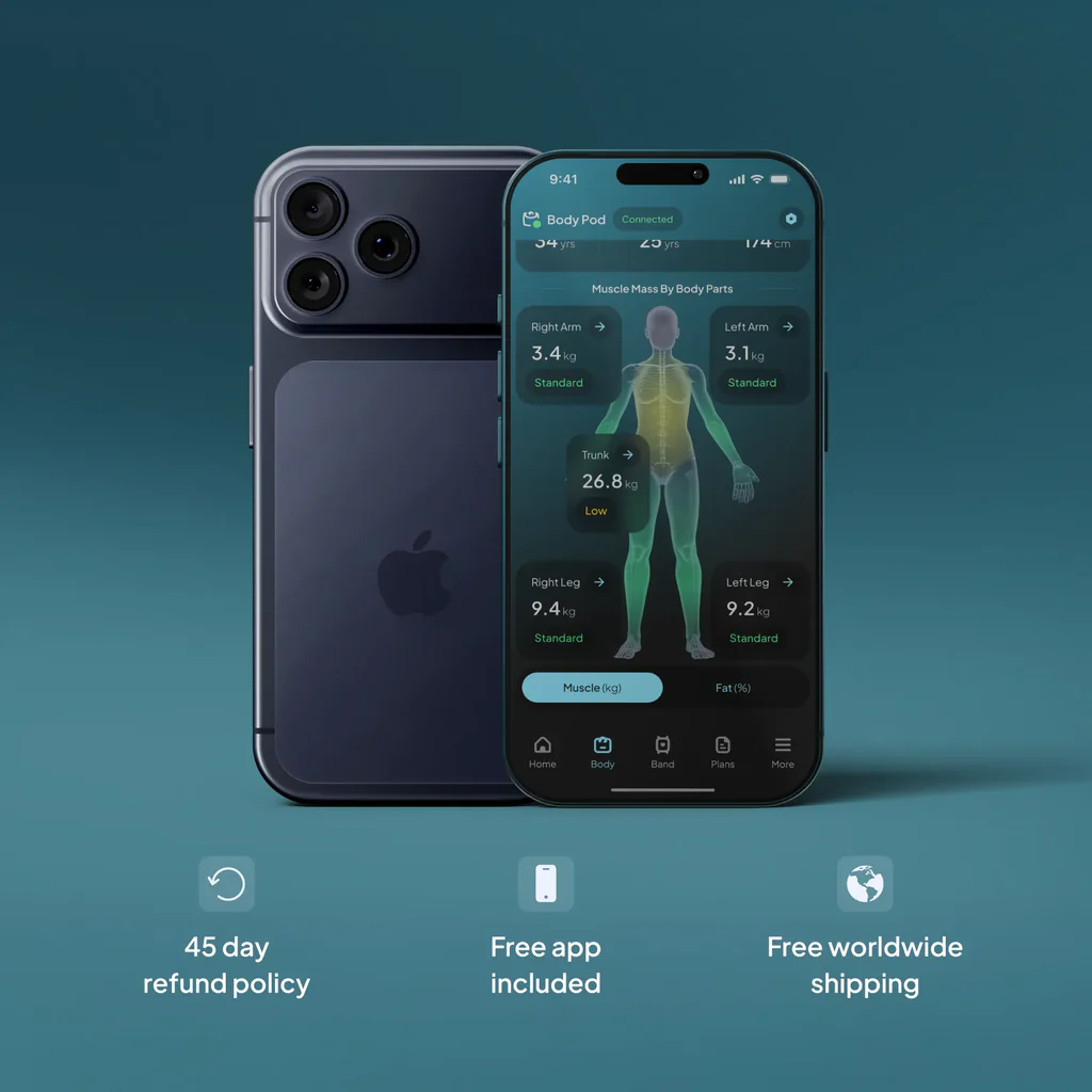 Stand on the Body Pod and hold the hand sensors — in about 60 seconds the device scans your entire body using bioelectrical signals and syncs the results to your phone. The app visualizes your composition trends over time and helps you understand how habits like sleep, food, and activity impact your body.