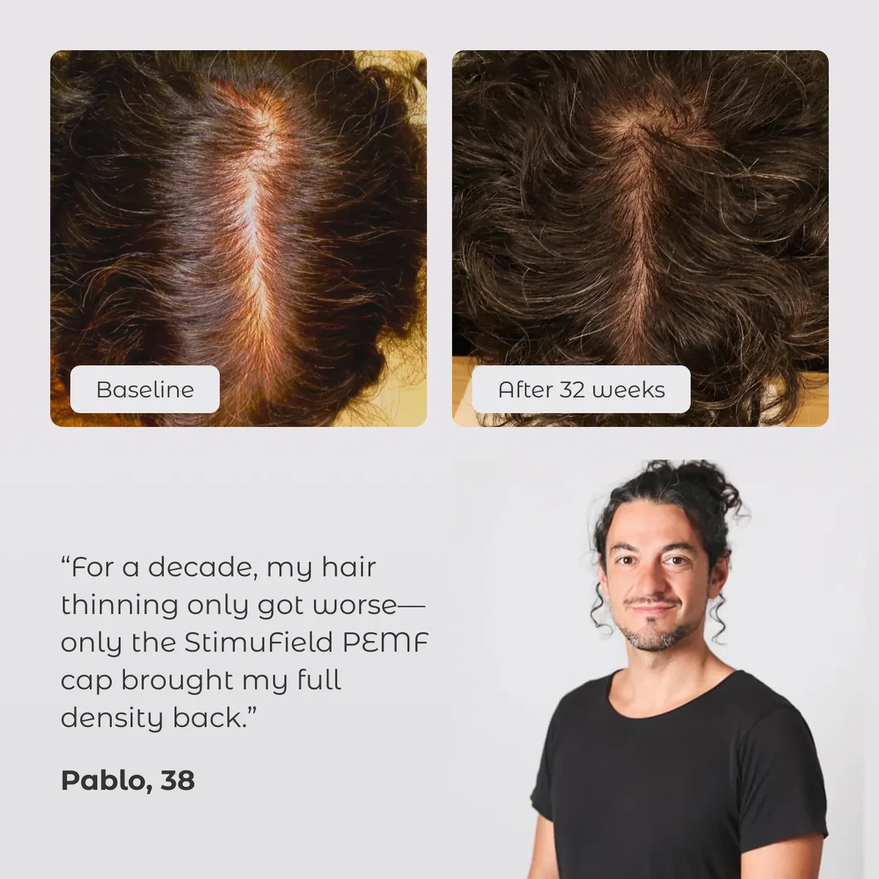 The StimuField™ PEMF Cap is an advanced wearable device engineered with ICES® (Inductively Coupled Electrical Stimulation) PEMF technology to support hair density, reduce shedding, and improve the appearance of thinning hair — all without medications or invasive treatments.