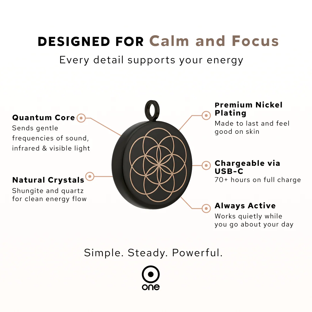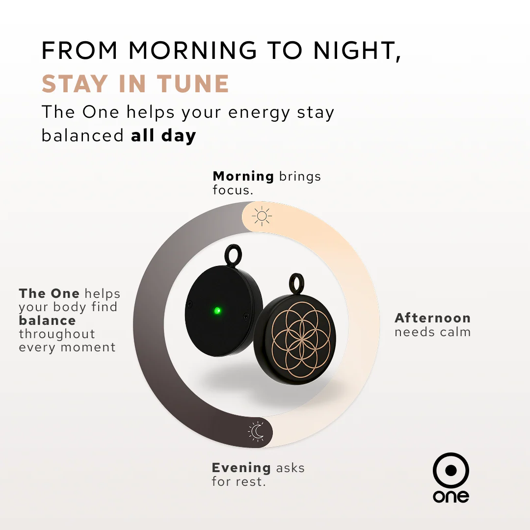 The One Device (Wearable Wellness Bio-Tuning Device) uses light, sound, and vibration frequency technology in a stylish jewelry-like form to support stress reduction, improved focus, better sleep, and overall energetic balance.